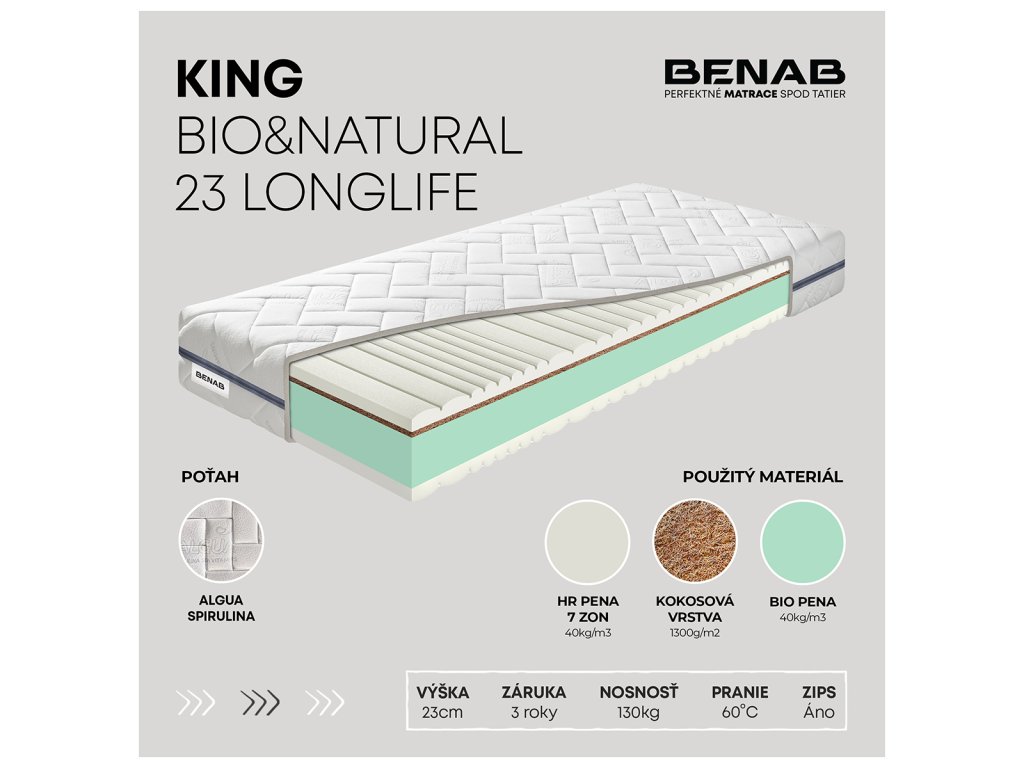 Matrac King Bio&Natural 23 Longlife s jadrom z BIO peny s prírodnými olejmi a perforáciou pre lepšie odvetranie. Tvrdšiu stranu spevňuje kokosová vrstva. Poťah obsahuje prírodné vlákna z morských rias, ktoré prispievajú k zdravej a hygienickej funkcii matraca.