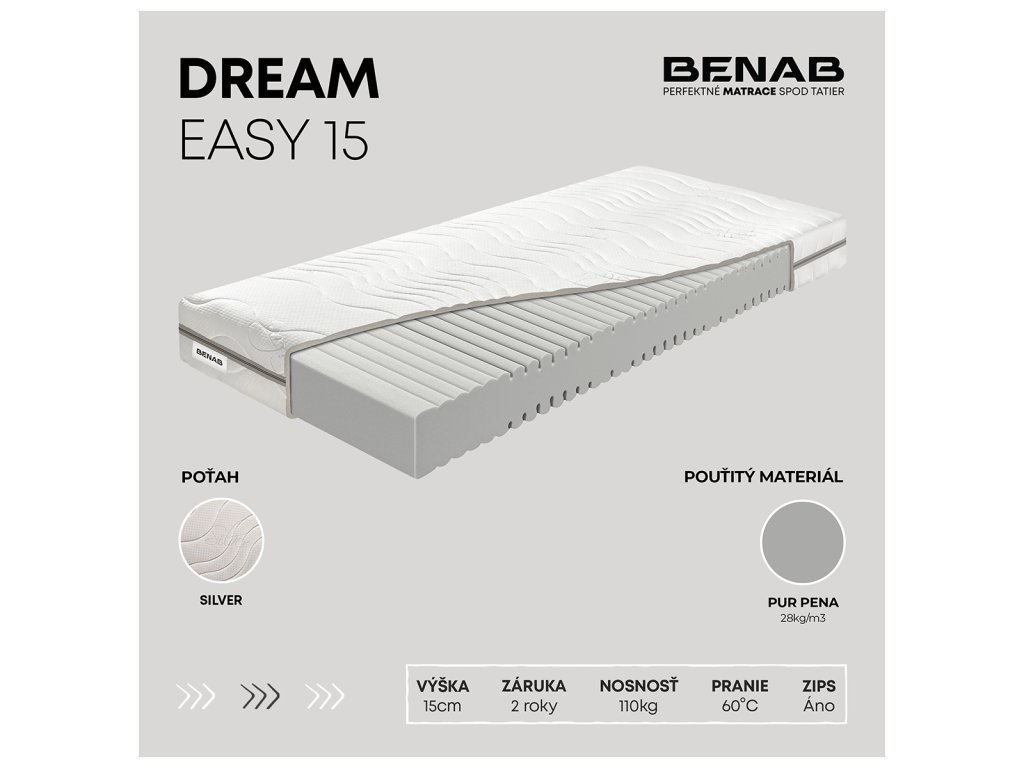 Matrac Dream Easy 15 je jednoduchý a pohodlný matrac s kvalitnou PUR penou a príjemným poťahom. Ponúka dobrý komfort za výhodnú cenu a vďaka nižšej výške je vhodný pre ľahšie osoby.
