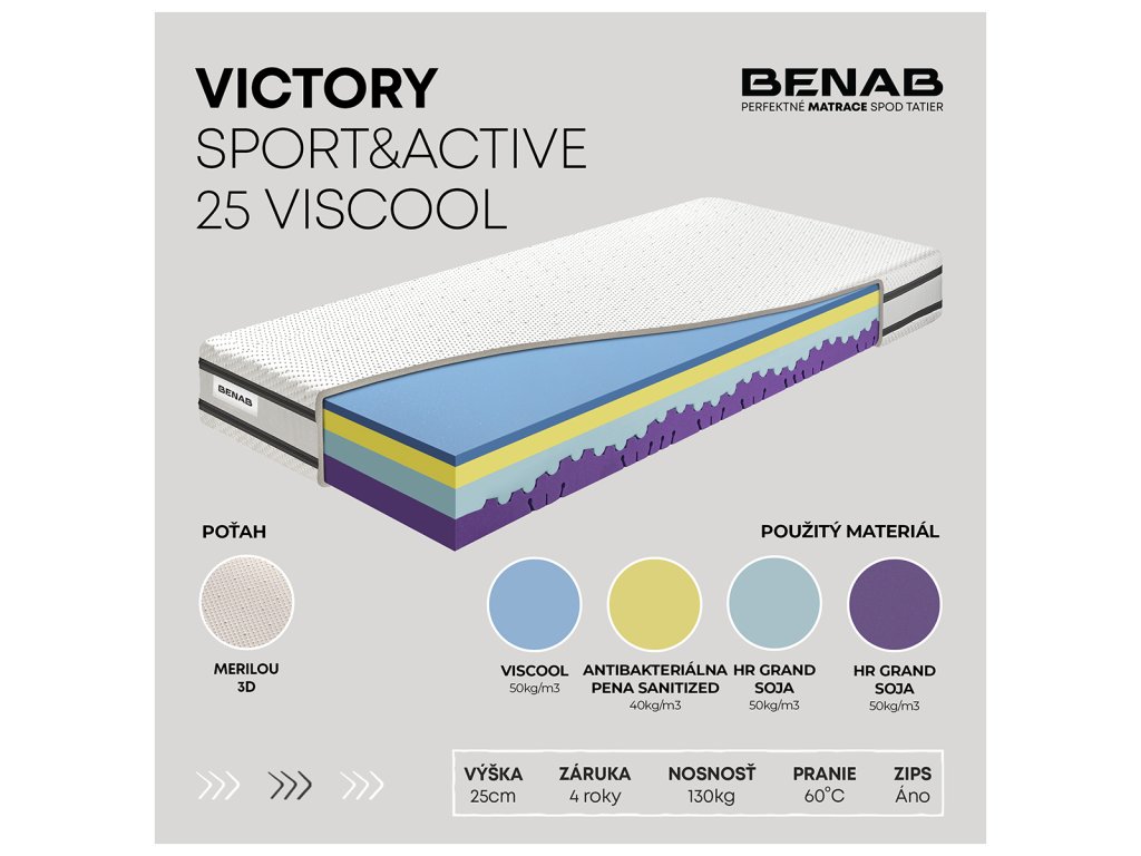 Matrac Victory Sport&Active 25 Viscool je hi-end matrac s modernou pamäťovou penou Viscool, ktorá sa prispôsobí telu a vďaka rýchlejšiemu odvádzaniu tepla zabraňuje prehrievaniu. Jadro tvorí kombinácia technologicky pokročilých pien Sanitized® a Grand-Soya, ktoré poskytujú vysokú hygienu a podporujú zdravý spánok.