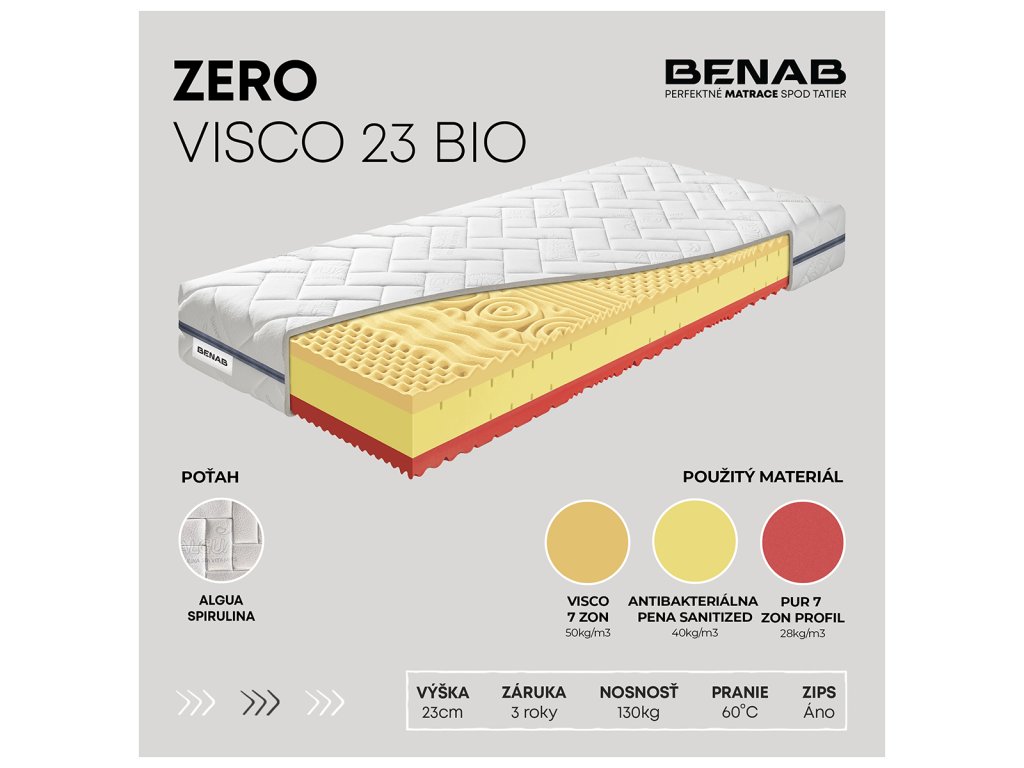 Matrac Zero Visco 23 Bio ma vrstvu 5 cm pamäťovej peny Visco, antibakteriálnym jadrom Sanitized® s odvetraním a poťahom obohateným o výťažky zo Spiruliny. Ponúka komfort a hygienické vlastnosti za výhodnú cenu.